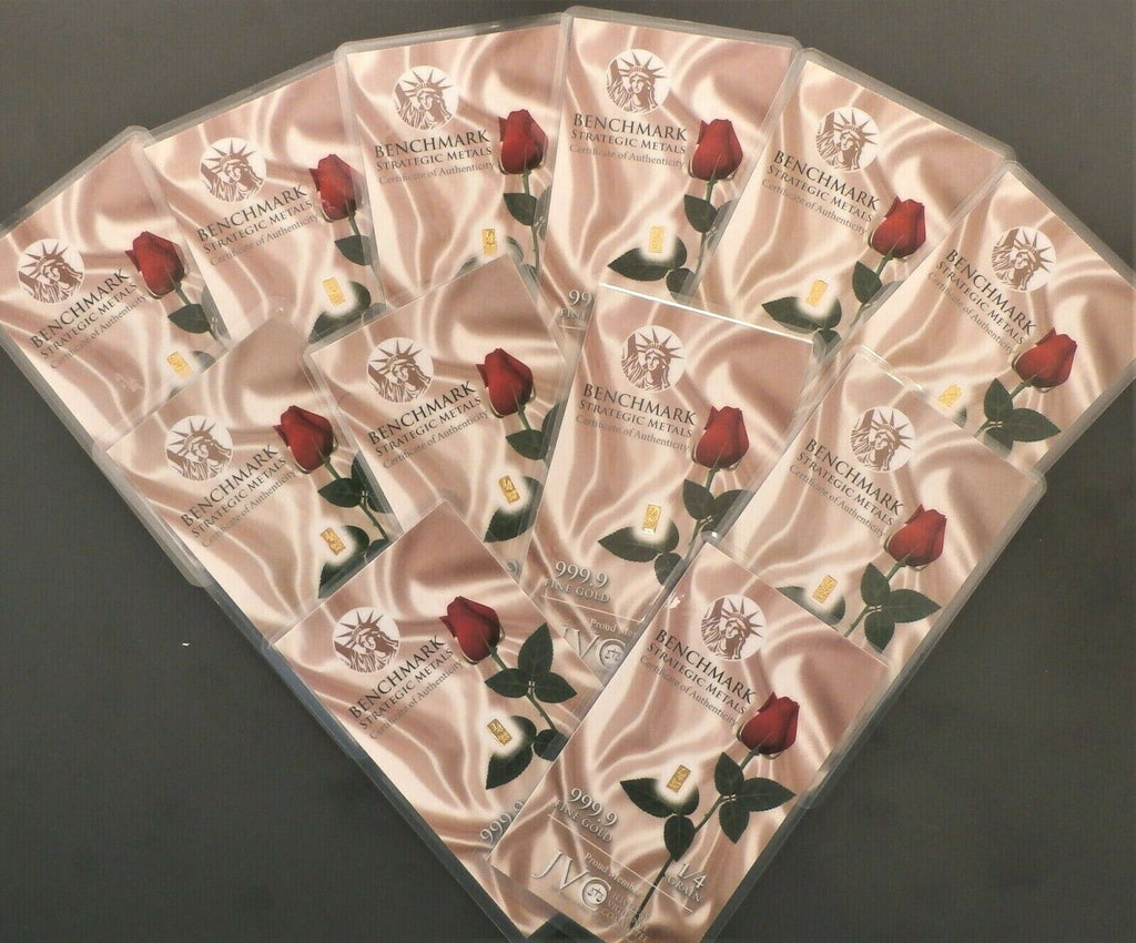 LOT 12 X 1/4 GRAIN .9999 FINE 24K GOLD BULLION BARS “ONE DOZEN ROSE WITH GOLD BARS” - IN COA CARD WHITE