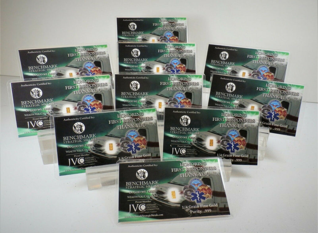 LOT 10 X 1/4 GRAIN .9999 FINE 24K GOLD BULLION BARS “FIRST RESPONDERS” - IN COA CARD