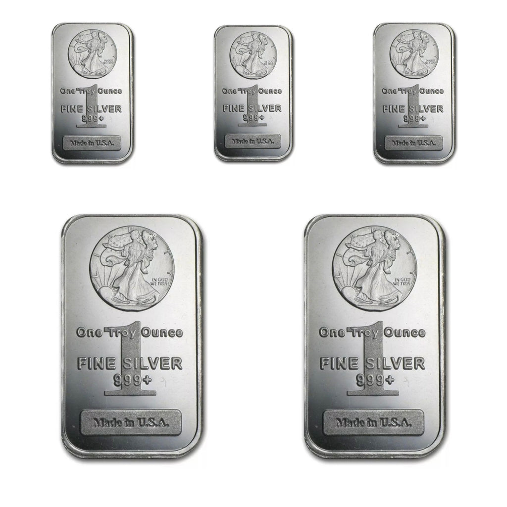 LOT 5 X 1 TROY OZ .999 FINE SILVER WALKING LIBERTY BARS BU