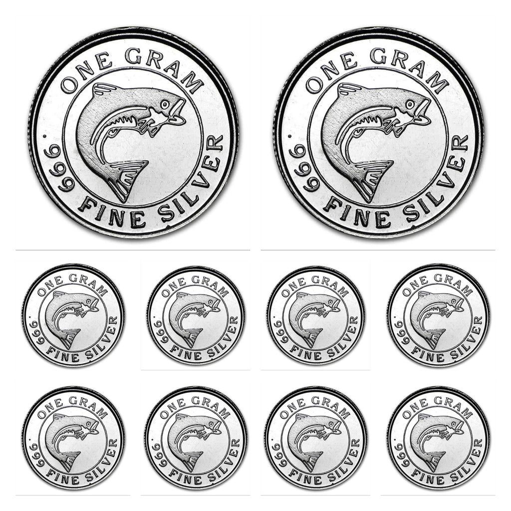 LOT 10 X 1 GRAM .999 FINE SILVER MONARCH SALMON FISH ROUNDS BU
